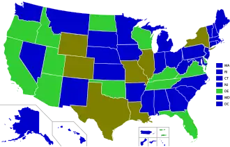 | Alabama, Alaska, Arkansas, Connecticut, District of Columbia, Géorgie, Hawaï, Indiana, Iowa, Kansas, Kentucky, Maine, Maryland, Massachusetts, Michigan, Minnesota, Mississippi, Montana, Nevada, New Hampshire, New Jersey, Nouveau-Mexique, Caroline du Nord, Ohio, Oklahoma, Pennsylvanie, Rhode Island, Caroline du Sud, Dakota du Sud, Vermont, Washington, Virginie Occidental | Colorado, Illinois, Louisiane, Missouri, Nebraska, New York, Texas | Arizona, Californie, Delaware, Floride, Idaho, Dakota du Nord, Oregon, Tennessee, Utah, Virginie, Wisconsin, Wyoming. |