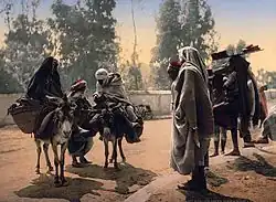 « Les animaux les plus nombreux sont, sans contredit, les ânes. Il n'est peut-être pas une seule famille tunisienne, si pauvre soit-elle, qui n'ait un âne à sa disposition. Je ne crois pas être au-dessous de la vérité en estimant à un âne par cinq individus, soit à trois cent mille, le nombre total des ânes qui existent en Tunisie. Ce sont des animaux de très petite taille, mais robustes et plus sobres encore que le chameau, si la chose est possible. C'est à eux qu'incombent toutes les corvées domestiques, c'est avec eux que les femmes vont chercher de l'eau aux puits, que les hommes portent au marché leurs denrées, ce sont eux qui transportent au village tous les produits des jardins et des champs, le maïs, la luzerne pour les moutons et les bœufs, le blé et l'orge qui viennent d'être moissonnés, c'est à eux encore que revient le soin de transporter le matériel restreint des ménages qui émigrent. L'âne est, enfin, le coursier des gens pauvres »