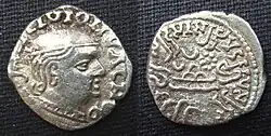 Monnaie d'argent du satrape occidental Rudrasena Ier (en) (200-222).