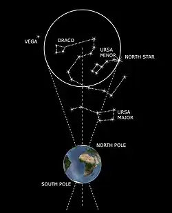 - ↑ Vue depuis la Terre, la succession des étoiles polaires septentrionales se fait dans le sens inverse des aiguilles d’une montre, et la succession des étoiles polaires australes dans le sens des aiguilles d’une montre.
