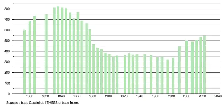 L'évolution du nombre d'habitants est connue à travers les recensements de la population effectués dans la commune depuis 1793. Pour les communes de moins de 10 000 habitants, une enquête de recensement portant sur toute la population est réalisée tous les cinq ans, les populations de référence des années intermédiaires étant quant à elles estimées par interpolation ou extrapolation[16]. Pour la commune, le premier recensement exhaustif entrant dans le cadre du nouveau dispositif a été réalisé en 2007[17].