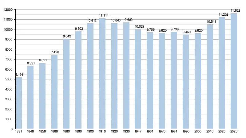 Les chiffres des années 1831 à 1970 tiennent compte des chiffres des anciennes communes fusionnées.