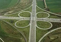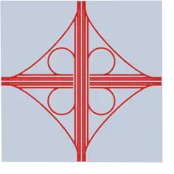 Le premier brevet d'un échangeur en trèfle est déposé le par l'ingénieur civil américain Arthur Hale[1]. C'est l'un des tout premiers types d'échangeurs qui se développe dans les années 1930 aux États-Unis mais est très utilisé également en Allemagne. C'est un échangeur massif, demandant une très grande emprise n'étant généralement justifié que par un trafic important. Le modèle ci-contre comprend également des collectrices latérales, destinées à éviter les croisements de flux de circulation.