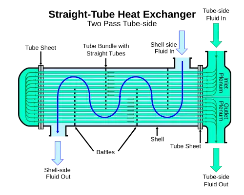 Ils peuvent également être utilisés pour refroidir ou chauffer d'autres fluides, tels que l'eau de piscine ou l'air de suralimentation d'un moteur[5]. L'un des avantages de l'utilisation d'un échangeur de chaleur à tube et coque est qu'ils sont souvent faciles à entretenir, en particulier dans les modèles où un faisceau de tubes flottant (dont les plaques à tubes ne sont pas soudées à la coque extérieure) est utilisé[6].