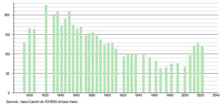 L'évolution du nombre d'habitants est connue à travers les recensements de la population effectués dans la commune depuis 1793. Pour les communes de moins de 10 000 habitants, une enquête de recensement portant sur toute la population est réalisée tous les cinq ans, les populations de référence des années intermédiaires étant quant à elles estimées par interpolation ou extrapolation[16]. Pour la commune, le premier recensement exhaustif entrant dans le cadre du nouveau dispositif a été réalisé en 2006[17].