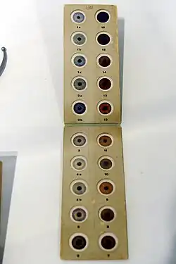 En 1930 K. Saller publie un tableau de dessins en couleur reproduisant des yeux artificiels et présente ainsi 40 nuances classées en 3 catégories[7] :