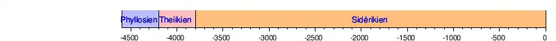 - Sidérikien : « âge ferrique[14], » époque de formation des oxydes de fer anhydres, omniprésents à la surface de la planète et responsables de sa couleur rouge.