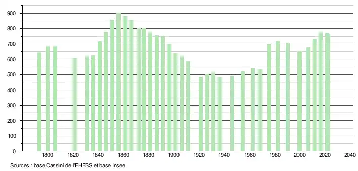 L'évolution du nombre d'habitants est connue à travers les recensements de la population effectués dans la commune depuis 1793. Pour les communes de moins de 10 000 habitants, une enquête de recensement portant sur toute la population est réalisée tous les cinq ans, les populations de référence des années intermédiaires étant quant à elles estimées par interpolation ou extrapolation[17]. Pour la commune, le premier recensement exhaustif entrant dans le cadre du nouveau dispositif a été réalisé en 2006[18].