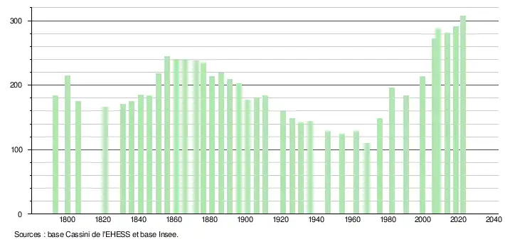 L'évolution du nombre d'habitants est connue à travers les recensements de la population effectués dans la commune depuis 1793. Pour les communes de moins de 10 000 habitants, une enquête de recensement portant sur toute la population est réalisée tous les cinq ans, les populations de référence des années intermédiaires étant quant à elles estimées par interpolation ou extrapolation[15]. Pour la commune, le premier recensement exhaustif entrant dans le cadre du nouveau dispositif a été réalisé en 2008[16].