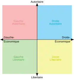 Un autre modèle est celui du libertarien David Nolan. Ce diagramme montre ce qu'il considère comme les « libertés économiques » (comme le niveau des impôts, le marché libre et la libre entreprise) sur l'axe des abscisses, et les « libertés individuelles » (liberté de circulation, laïcité, libre possession de son corps qui regroupe la légalisation des drogues, l'avortement, l'euthanasie, etc.) sur l'axe des ordonnées.