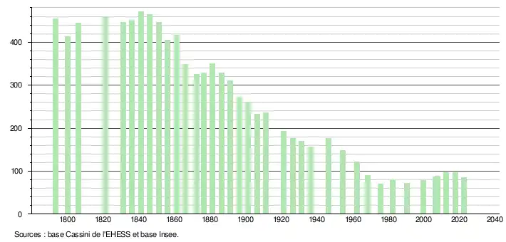 L'évolution du nombre d'habitants est connue à travers les recensements de la population effectués dans la commune depuis 1793. Pour les communes de moins de 10 000 habitants, une enquête de recensement portant sur toute la population est réalisée tous les cinq ans, les populations de référence des années intermédiaires étant quant à elles estimées par interpolation ou extrapolation[37]. Pour la commune, le premier recensement exhaustif entrant dans le cadre du nouveau dispositif a été réalisé en 2007[38].