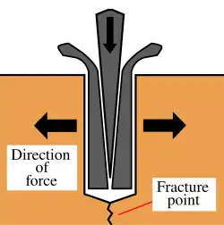 L'éclateur de roche est semblable au coin, mais l'adjonction des pattes permet de renvoyer la force de choc sur les côtés.