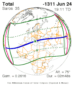 L'atlas des éclipses solaires de Jean Meeus et Fred Espenak mentionne justement une éclipse totale, visible dans le nord de l'Anatolie, le 24 juin -1311, vers 11 heures TU. Soit, en calendrier julien proleptique, le 24 juin 1312 av. J.-C., à environ une heure de l'après-midi, en heure locale. La concordance est suffisamment remarquable pour penser que le « signe du Soleil » était bien cette éclipse.