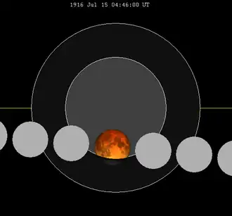 Une éclipse lunaire partielle a eu lieu le samedi 15 juillet 1916. La Lune était fortement cachée dans l'ombre lors de cette éclipse partielle profonde qui a duré 2 heures et 53 minutes, avec 79 % de la Lune dans l'ombre au maximum.