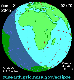 Cette éclipse totale commencera en deçà des côtes, au Sud de la pointe Est du Brésil au lever du soleil local, puis traversera tout l'Océan Atlantique, pour toucher l'Angola où il y aura le maximum, puis continuera sur l'Afrique australe pour finir au Sud de l'Océan Indien.