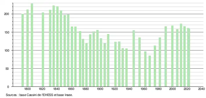 L'évolution du nombre d'habitants est connue à travers les recensements de la population effectués dans la commune depuis 1793. Pour les communes de moins de 10 000 habitants, une enquête de recensement portant sur toute la population est réalisée tous les cinq ans, les populations de référence des années intermédiaires étant quant à elles estimées par interpolation ou extrapolation[21]. Pour la commune, le premier recensement exhaustif entrant dans le cadre du nouveau dispositif a été réalisé en 2006[22].