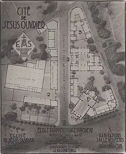 Les bâtiments construits entre 1934 et 1936 dans un style moderniste art déco par l’architecte lyonnais Georges Curtelin[30] se composent de deux bâtiments rectangulaires : le bâtiment principal et la chapelle. Il faisait partie d’un projet plus vaste appelé « Cité de Jésus Ouvrier »[31]. Dans ce projet, il était prévu de construire une église à l’angle de l’avenue Berthelot et du futur boulevard Jean XXIII ainsi que des habitations et une salle des fêtes à l’angle de la rue Bataille et du futur boulevard Jean XXIII[32]. Seule l’école d’apprentissage supérieur sera construite et les « ateliers bois » et les « ateliers fer » seront implantés en face dans les anciennes usines Cottin & Desgouttes[33].