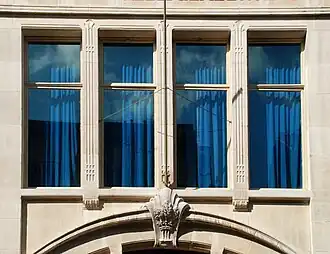 La façade du premier étage présente un ensemble de quatre grandes baies rectangulaires séparées par d'élégants motifs sculptés plutôt typiques de l'Art nouveau géométrique.