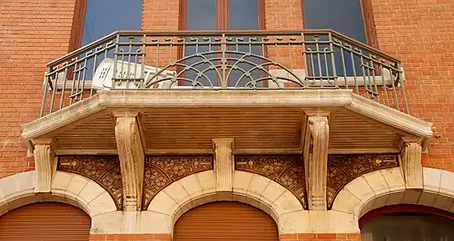 Le premier étage est orné d'un balcon en fer forgé supporté par cinq élégantes consoles Art nouveau entre lesquelles prennent place de beaux sgraffites aux motifs floraux stylisés.