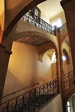 À l'intérieur du bâtiment se trouve un escalier intérieur, datant du XVIIe siècle et menant aux étages. Il est inscrit à l'inventaire supplémentaire des monuments historiques par arrêté du , tout comme l'oratoire du Cardinal Tencin datant du XVIIIe siècle et le vestibule d'entrée et sa voûte[5].