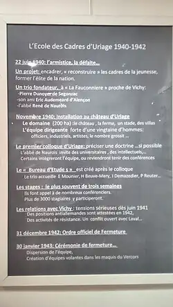 Xavier de Virieu, qui avait rejoint Pierre Dunoyer de Segonzac à la fermeture de l’école, prend la direction de l’école militaire d’Uriage[31] dans le château débarrassé de la Milice de Darnand.