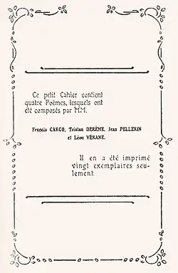 La publication d'un Petit Cahier (Tarbes, 1911), par Carco, Derème, Vérane et Pellerin donna le coup d'envoi à ce courant poétique qui s'inspirait des écrits fantaisistes de certains prédécesseurs comme Georges Fourest, Franc-Nohain ou Tristan Klingsor. Le groupe se définissait par son refus du romantisme et du symbolisme, du naturalisme et du positivisme. À ces grands courants du XIXe siècle, ils opposent la fantaisie (au sens large), le retour au burlesque. Ils adoptent des formes poétiques souples, ils privilégient le rythme et la chanson, tentant de trouver un équilibre entre sentimentalité, humour et mélancolie. Loin de l'hermétisme et du pessimisme des symbolistes et des décadents, les fantaisistes s'intéressent à la vie quotidienne, aux mots familiers, à l'imprévu et adoptent une grande liberté dans la versification tout en restant attachés aux thèmes de la patrie et de la nation.