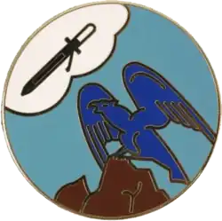 L’insigne de l’École militaire de l’air, issu d’un concours lancé auprès des promotions 1946-1947, symbolise l’élève-officier de l’EMA (un aigle déjà adulte) prêt à prendre son envol depuis un sommet escarpé (les épreuves des études militaires et scientifiques) afin d’atteindre un poignard d’officier placé dans les cieux (la consécration de la fin du cycle de formation).
