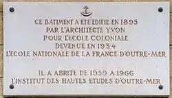 Dans un beau bâtiment édifié en 1895 par l'architecte Yvon, les fonctionnaires-stagiaires sont répartis en deux sections : Français et étrangers. Leurs études durent 2 ou 3 ans au bénéfice de promotions variant de 11 à 50 élèves et comprennent des enseignements de langues des pays d'outre-mer, d'ethnologie, de droit coutumier, de droit colonial public et privé.