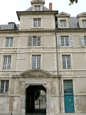 L’École nationale des beaux-arts de Bourges est créée en 1881 et intègre le nouveau bâtiment construit dans un style éclectique par l'architecte Alfred Leclerc[1] à l'emplacement de l'église des Carmes. Ce premier bâtiment est détruit en 1976. Depuis, l’ancien collège des Jésuites[2] est mis à disposition de l’école par la Ville de Bourges.