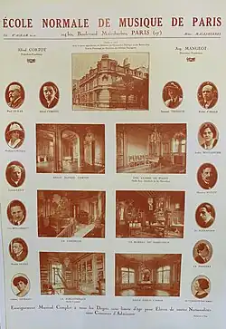 En 1927, l'école, bien que restant un établissement privé d'enseignement, est placée sous la double tutelle, honorifique, des ministères de l'Instruction publique et des Beaux-Arts et des Affaires étrangères. Installée à l'origine rue Jouffroy[5] avec une annexe rue d'Athènes, l'École emménage en 1927 à l'angle du boulevard Malesherbes. Les salles de cours se voient complétées en 1929 par une salle de concert attenante rue Cardinet dans laquelle se produit l'Orchestre de chambre de l'École sous l'égide de la société musicale des Concerts privés de l'École normale fondée par Alfred Cortot[6].