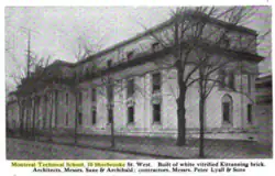 L'École technique de Montréal est une ancienne institution d'enseignement secondaire située à Montréal, au Québec (Canada). Fondée en 1907[4], elle est à l'origine de l'École du meuble de Montréal[5] et de l'École des arts graphiques de Montréal[6]. En 1946, après la création du ministère du Bien-être social et de la Jeunesse, les Écoles techniques accessibles après une neuvième année du primaire; dont plusieurs se sont ajoutées dans différentes villes du Québec, nécessitaient 3 ou 4 ans d'étude pour être diplômés. En 1958, le nom devint l'Institut de technologie de Montréal[7] et fut intégré au Cégep du Vieux Montréal lors de la formation de ce dernier en 1968[8],[9]. Le bâtiment principal est toujours existant et fait partie de l'UQAM depuis 1996[10].