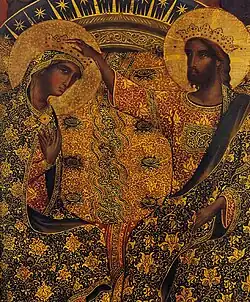 Au début du XIVe siècle, les peintres vénitiens s'ouvrent de plus en plus à la peinture du continent, et en particulier au mouvement gothique venant du Nord de l'Europe. Paolo Veneziano est le tout premier peintre vénitien dont nous connaissons le nom en tant qu'artiste[1]. Il fut le premier à élaborer un langage pictural personnel, en équilibre entre l'art byzantin et les nouveaux thèmes de la peinture gothique comme, ici, le couronnement de la Vierge. Les parties du corps représentées sont peintes suivant la tradition byzantine de l'époque : après une préparation en blanc (byzantin : leukos), sur un fond sombre (brun-vert , byzantin : sankir) les couleurs apposées sont de plus en plus claires, pour finir par le blanc[2]. La précision du travail relève d'un savoir-faire de miniaturiste produisant un effet de tapisserie. Les motifs floraux des vêtements du Christ et de la Vierge reproduisent des tissus de soie brodée inspirés de broderies chinoises[N 1] ou de céramiques chinoises[1] : un commerce par la route de la soie qui a repris son essor avec la dynastie Yuan, encore au pouvoir à cette époque en Chine[N 2], et qui aboutissait précisément à Venise. Par ailleurs les motifs en forme de vagues de tissus, entre le Christ et la Vierge, semblent être des motifs d'une calligraphie arabe de fantaisie, comme cela s'est pratiqué en Italie pendant plusieurs siècles avant et au cours de la Renaissance[3].