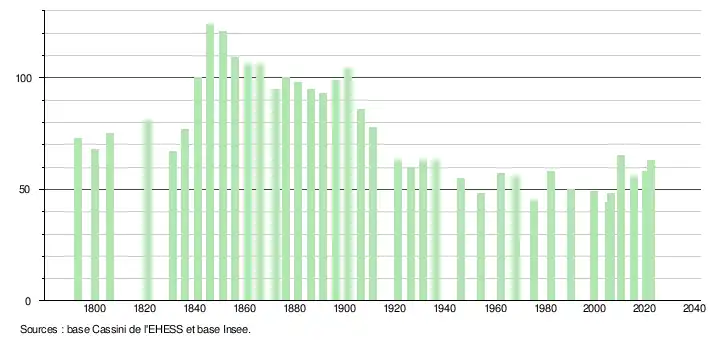 L'évolution du nombre d'habitants est connue à travers les recensements de la population effectués dans la commune depuis 1793. Pour les communes de moins de 10 000 habitants, une enquête de recensement portant sur toute la population est réalisée tous les cinq ans, les populations de référence des années intermédiaires étant quant à elles estimées par interpolation ou extrapolation[33]. Pour la commune, le premier recensement exhaustif entrant dans le cadre du nouveau dispositif a été réalisé en 2005[34].