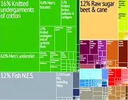 | Biens exportés | Vêtements 18,7 %, poisson transformé 11 %, sucre brut 10 %, diamants 6,76 % et autres |