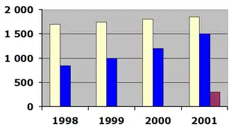 ![]() Évolution du nombre de lignes de téléphone fixe (beige), mobile (bleu) et d’utilisateurs d’internet (rouge) : 1998-2001 | |