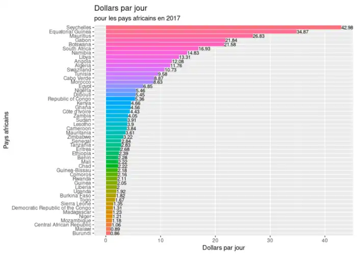 En 2018, toujours selon les taux de change officiels, le pays ayant le PIB le plus élevé du continent est le Nigeria avec 395 milliards de dollars et le pays ayant le PIB par habitant le plus élevé est la Guinée équatoriale[8]. L'étude du PIB montre de grandes disparités régionales. Ainsi, en 2015, trois pays, le Nigéria, l'Afrique du Sud et l'Égypte représentent à eux seuls plus de la moitié du PIB africain[9].