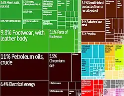 | Biens importés | textiles, chaussures, asphalte, métaux et minéraux, huile crue, légumes, fruits et tabac |
