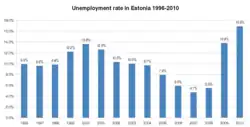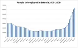 À partir de 2009, le pays a subi une grave crise économique, il a vu son taux de chômage monter au-dessus de 15,2 %, en [8]. L'économie de ce petit pays, très dépendante sur le plan financier des banques suédoises, s'est alors révélée très fragile. La crise financière de 2008 a provoqué une débâcle dans ce petit pays baltique qui avait formé sa propre bulle immobilière : entre et , le PIB a reculé de 15 %, la production industrielle de 34 %. Le gouvernement tente de renverser la situation essentiellement par des coupes budgétaires, avec pour priorité de réduire l'inflation et de maitriser les finances publiques[9] afin de pouvoir remplir les conditions d'entrée dans la zone euro dès 2011[10].