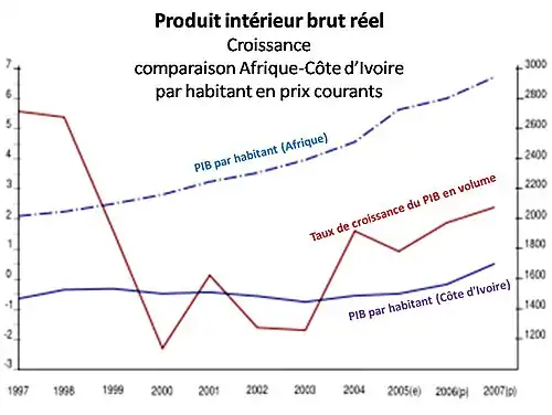 Les progrès constatés au cours des quinze premières années de l'indépendance ont fait place à une longue période de récession, favorisée par la chute des cours mondiaux des matières premières agricoles (café-cacao) et aggravée par divers facteurs dont la crise politico-militaire déclenchée en 2002. À la fin de la crise, le pays renoue avec une croissance rapide, connaissant même une des plus fortes croissances au monde entre 2012-2019, de l'ordre de 8,2 % en moyenne. Ce qui permet au pays de devenir le pays le plus riche de toute l'Afrique de l'Ouest, avec un PIB par habitant de 2 286 dollars fin 2019, devant deux pays particulièrement riches en richesses naturelles que sont le Nigeria (pétrole) et le Ghana (pétrole et or)[11].