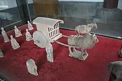 Les ateliers gouvernementaux des Han fabriquent des objets de luxe, des objets de la vie quotidienne et même des articles funéraires connus sous le terme de Mingqi (明器/冥器). Ces Mingqi incluent, entre autres, des figurines en céramique et des briques ou des tuiles servant à décorer les murs des tombeaux[78]. Ces ateliers sont sous la tutelle du Petit Trésorier (少府)[79].