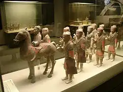 Avant la dynastie Han, les marchands situés à proximité de la frontière nord de la Chine avaient déjà commencé à commercer avec les tribus nomades de la Steppe eurasienne orientale[123]. Ce commerce est institutionnalisé au IIe siècle av. J.-C. par les accords Heqin, conclu entre les Han et les nomades Xiongnu. Ces accords de paix prévoient, entre autres, des mariages entre les familles régnantes des deux pays et le versement par les Chinois d'un tribut dont le montant exact est inconnu. En 89 av. J.-C., quand Hulugu Chanyu (狐鹿姑) (r. 95 - 85 av. J.-C.) veut renouveler les accords Heqin, il demande un tribut annuel de 10,000 dan de vin (soit à peu près 400 000 l), 5 000 hu du grain (soit à peu près 100 000 l) et 10 000 balles de soie[124],[125]. Ces quantités de vin, de grain et de soie sont considérées comme une augmentation significative du montant antérieur du tribut, qui devait être bien moindre[124]. En plus de ces arrangements officiels, les échanges commerciaux les plus courants entre les marchands des Xiongnu et ceux des Han portent sur le commerce de chevaux et de fourrures Xiongnu, contre des produits agro-alimentaires et des articles de luxe Han; la soie étant le produit de luxe le plus recherché[123]. Il existe également un marché noir très lucratif, permettant aux Xiongnu d'acheter et d'importer clandestinement des armes en fer venant de l'empire des Han[123].