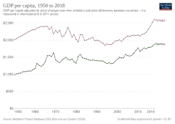 Le PIB actuel per capita de la Gambie a enregistré une croissance maximale de 233 % dans les années 1970. Mais cela s'avéra intenable, et par conséquent il diminua de 8,3 % dans les années 1980 et encore de 5,2 % dans les années 1990. Le tourisme s'y divise en trois catégories. Il y a les vacances traditionnelles "sea, sex and sun" profitant du climat très chaud et des plages merveilleuses. La Gambie est aussi la première destination africaine pour beaucoup d'Européens amateurs d'oiseaux, étant donné sa faune aviaire spectaculaire et facile d'accès. Il y a également un nombre significatif d'Afro-Américains sur la trace de leurs racines dans ce pays, où tant d'Africains ont été capturés à l'époque du commerce des esclaves[8].