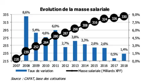 Sur la période 2007-2018, la masse salariale, calculée à partir de l’assiette des cotisations à la CAFAT a fortement progressé : +110 milliards francs Pacifique (922 M€) soit +50 %. En revanche, après la fin des grands travaux (notamment des usines métallurgiques), son rythme de croissance s’est progressivement ralenti. En 2018, la masse salariale dépasse tout de même la barre des 330 milliards francs Pacifique (2,8 Mrd€), soit un rythme de croissance qui s’accélère sur un an (1,4 %), tout en restant encore sensiblement en dessous de la moyenne enregistrée sur la période (3,8 %). Selon les données provisoires de l’étude prospective emploi-formation du SAP-NC, le salaire moyen s’élève à 314 052 XPF (2 632 €) par mois en 2017 (275 000 XPF ou 2 300 €) pour le salaire médian). Il a progressé de 14,4 % entre 2011 et 2017. Sur la même période, le salaire médian a augmenté plus rapidement (+19,6 %), induisant un recul de l’écart avec le salaire moyen et donc une diminution de la disparité des salaires distribués[17].