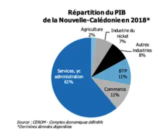 Le PIB de la Nouvelle-Calédonie est estimé à 1 028 milliards de francs Pacifique (8,614 milliards d'euros) en 2018 avec un secteur tertiaire majoritaire (72 % du PIB), viennent ensuite le secteur secondaire (26 % du PIB) et le secteur primaire (2 %).