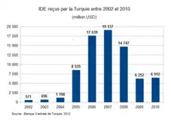 La consommation privée soutenue, le taux d'investissements élevé et le déficit de la balance commerciale ont conduit le pays à recourir aux flux de capitaux étrangers (IDE et investissements de portefeuille). Le taux d'épargne (14,5 % du PIB[13]) bien que supérieur à celui du Royaume-Uni (12,9 %) ou des États-Unis (11,6 %) ne suffisait pas à apporter les sommes nécessaires au développement économique du pays. La vigueur de l'économie turque en 2010 s'est accompagnée de tensions inflationnistes (+8,7 %).