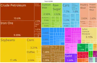| Biens exportés | soja, minerai de fer, pétrole, patê (cellulose), maïs, bœuf, viande de poulet, farine de soja, sucre, café, tabac, coton, jus d'orange, chaussures, acier, avions, automobiles, pièces de véhicules, or, éthanol, matériel de transport |