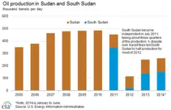 Avant l'indépendance, le Soudan du Sud produisait 85 % de la production pétrolière soudanaise[11]. Conformément à l'Accord de paix global (APG), les revenus pétroliers devaient être répartis équitablement pendant toute la durée de l'accord. Le Soudan du Sud s'appuyant sur les oléoducs, les raffineries et les installations portuaires de l'État de la mer Rouge, au Soudan du Nord, l'accord stipulait que le gouvernement de Khartoum recevrait 50 % de l'ensemble des revenus pétroliers. Selon le ministère des Finances et de la Planification économique du gouvernement sud-soudanais, les revenus pétroliers représentent plus de 98 % du budget du gouvernement sud-soudanais, et ont atteint plus de 8 milliards de dollars de recettes depuis la signature de l'accord de paix[12].