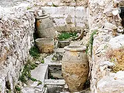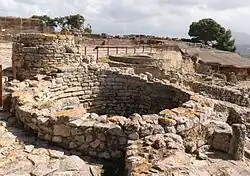 La civilisation mycénienne succède à la civilisation minoenne. La connaissance de l'organisation politique de la société mycénienne est meilleure à l'échelle locale, grâce aux sources administratives en linéaire B provenant des palais de Pylos et de Cnossos, ou encore de Thèbes[9]. Les produits des terres agricoles environnantes ont été collectés, enregistrés et stockés dans les palais, comme en témoignent le grand nombre de magasins et de pithos (pots de stockage) récupérés. La découverte de tablettes en Linéaire A et Linéaire B, répertoriant les produits dans les zones d'archives du Palais de Knossos, suggère une bureaucratie très organisée et un système de tenue de registres qui contrôlait tous les produits entrants et sortants. À Pylos, des archives similaires montrent que le palais prélevait des taxes en nature sur des membres des communautés rurales, sans doute en tant que redevance contre l'attribution de terres palatiales[10]. De plus, la métallurgie est également documentée à Pylos par une série de tablettes qui montre que le palais distribuait du bronze à des forgerons qui devaient ensuite rendre le produit fini.