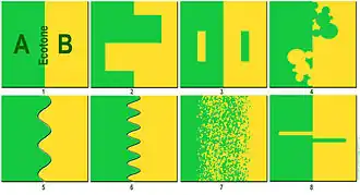 - il « isole » ou « réunit » plus ou moins, et de manière symétrique ou non les habitats A et B. Cet « effet barrière » dépend à la fois du type d'écotone et de la taille de l'organisme considéré, de ses capacités de mobilité (vol, nage) et de sa densité de population de chaque côté de l'écotone (effet densité-dépendant).