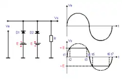 Suivant le sens de la tension E appliquée, on obtient un signal écrêté au-dessus de la masse ou au-dessous. Suivant le sens de branchement de la diode, on écrête soit l'alternance positive, soit l'alternance négative. Les sources de tension continue doivent être découplées avec un condensateur.